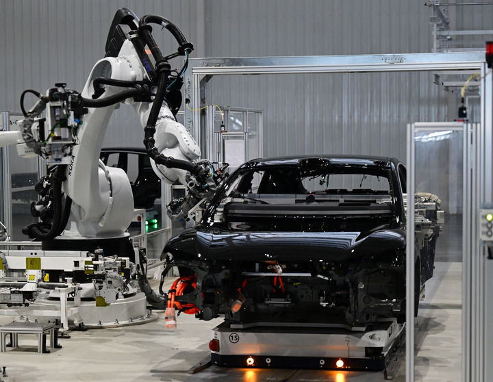 2025年7月1日在合肥市新橋智能電動汽車產(chǎn)業(yè)園蔚來第二工廠拍攝的新能源汽車生產(chǎn)線。新華社記者 周牧 攝